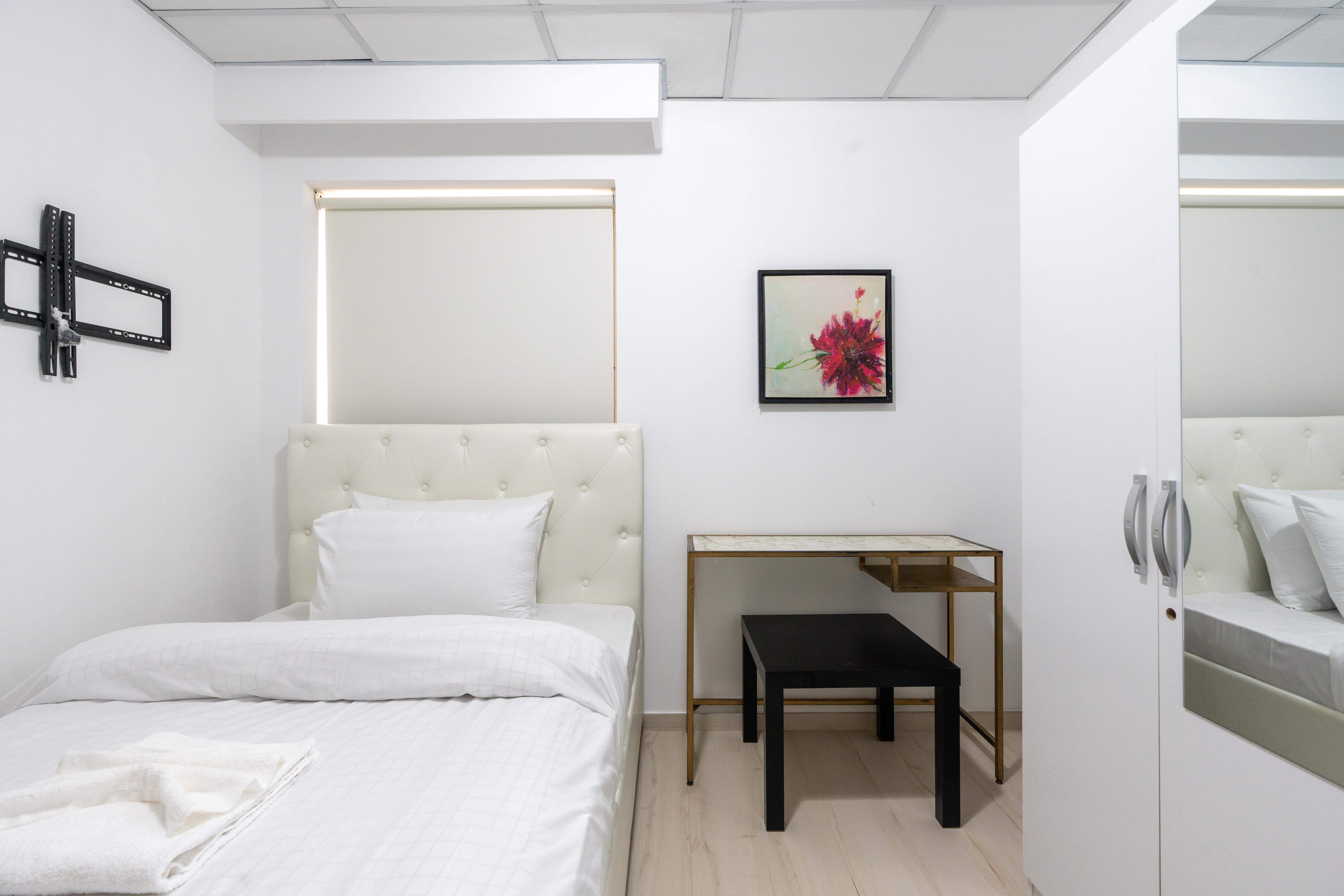 • The master bedroom is a haven of tranquility, featuring a king-sized bed, ample storage, and an en-suite bathroom with a shower cubicle.